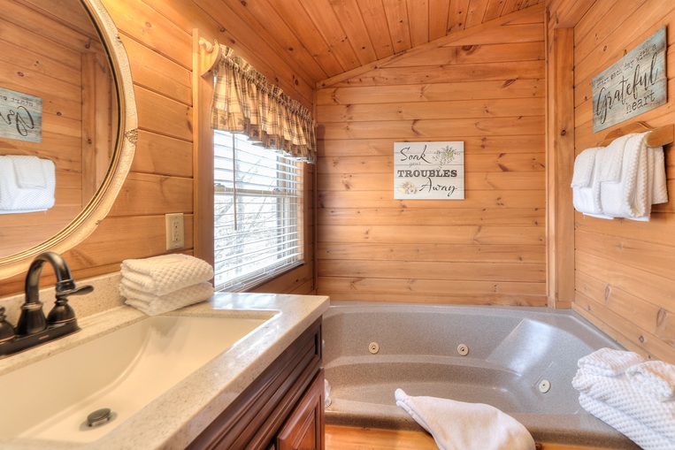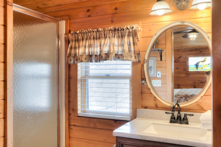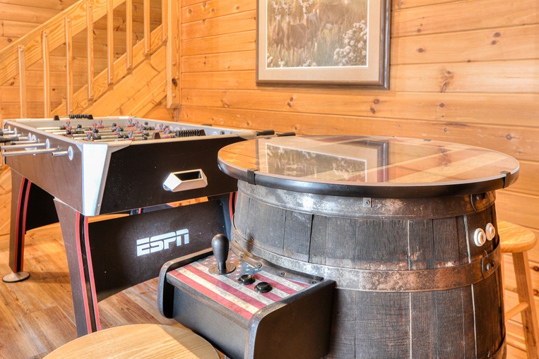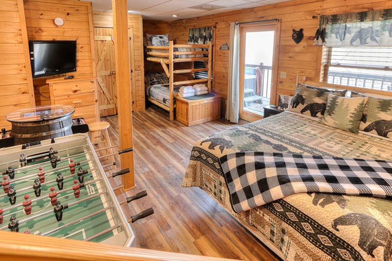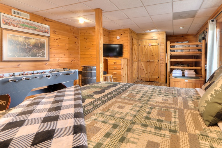 This cabin is perfect for a family, with a private lower level BONUS ROOM providing a Twin bunk, Queen bed, and second bathroom with a standing shower. There is even a Foosball table for evenings or rainy days. It’s a great place to get away from it all.