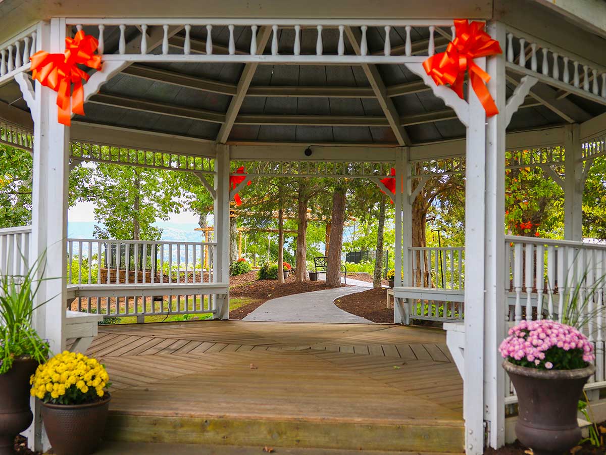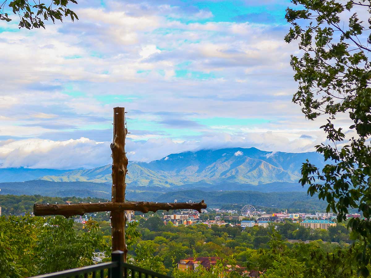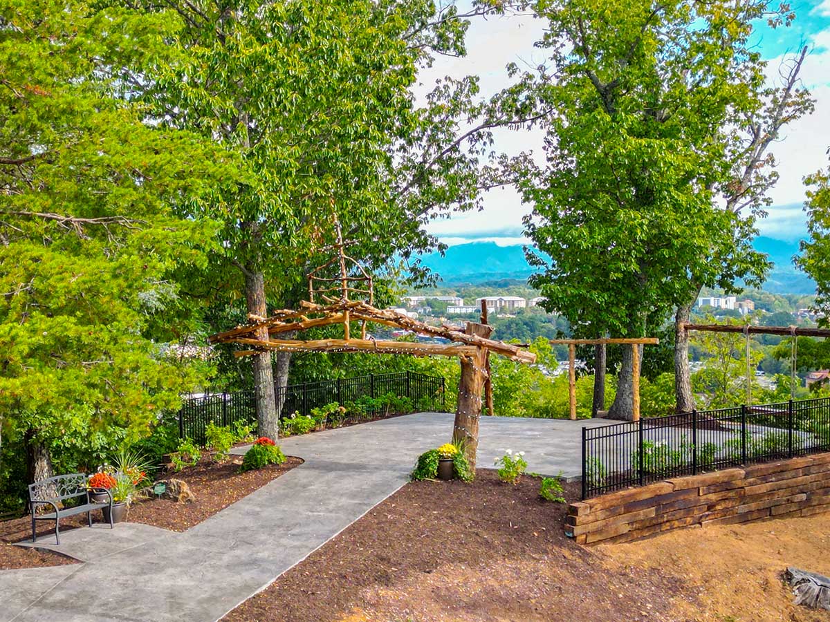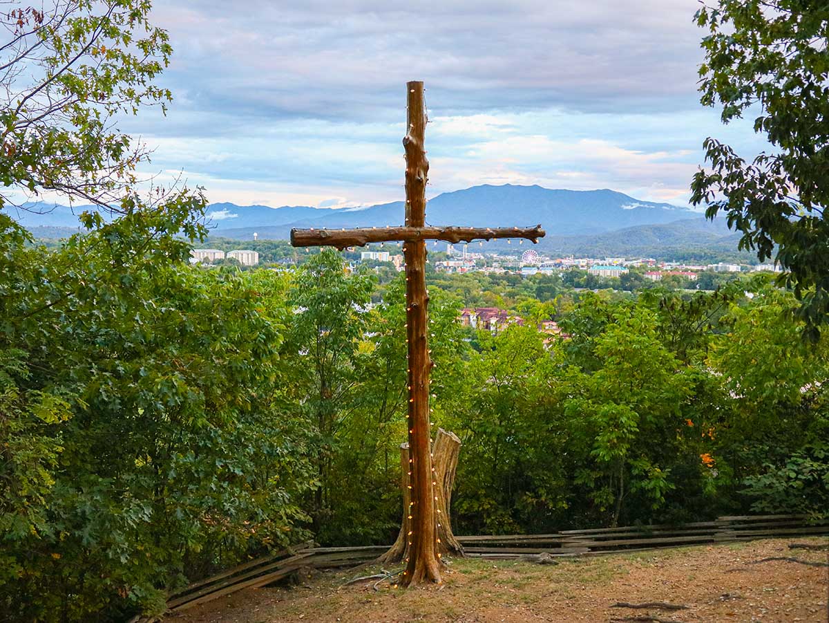 With stunning views across the lights of Pigeon Forge and to the Smoky Mountains beyond, this open air venue will provide a peaceful and blessed place to say “I Do.” The grounds are beautifully- landscaped around pebbled paths that lead under an arbor to our Mountaintop Gazebo. From the gazebo, continue down the winding path under a second arbor made of vines to the crest of the mountain, where you’ll find a soaring wooden cross directing your gaze toward the majesty of God’s creation.